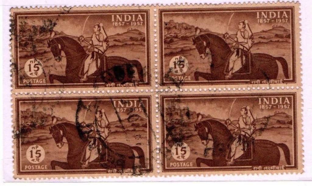 A block of 4 on Rani Lakshmibai of Jhansi. The Rani of Jhansi, also known as Rani Lakshmibai, was one of the leading figures of the Indian Rebellion of 1857. The queen consort of the princely state of Jhansi from 1843 to 1853, she assumed its leadership after the outbreak of conflict and fought several battles against the British