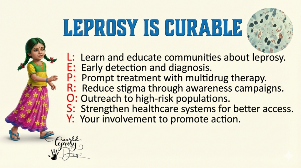 • L – Learn and educate communities about leprosy to dispel myths and misinformation.