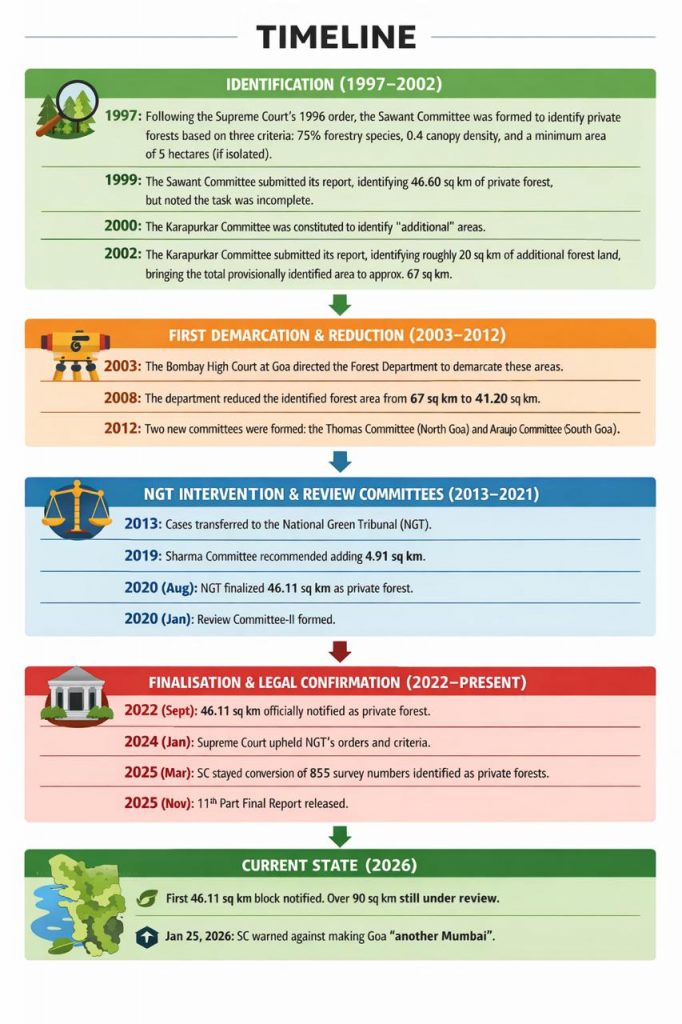 Karapurkar Committee identified another 20.52 sq km of private forest area in Goa. Thus, the total area of private forest identified by both committees was 67.12 sq km in 2002. However, the Karapurkar Committee had stated in its report that the process of identifying of private forest was still incomplete. This necessitated setting up another committee to give full effect to the 1996 order of the SC.