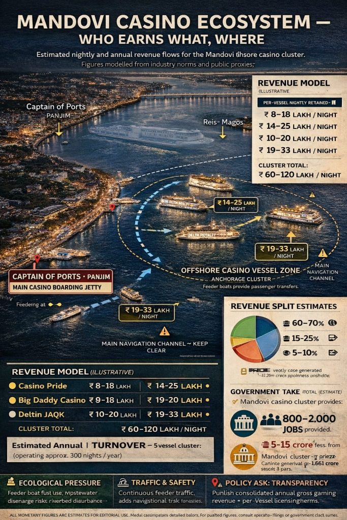 A GIGANTIC 100-meter long casino vessel is expected to impose an unbearable burden on the already oppressed Mandovi river soon. In what is claimed to be a replacement for the existing Deltin Royale owned by Jaydev Modi, the new casino vessel will have a built up gambling areas of 65,000 sq ft spread over eight floors.