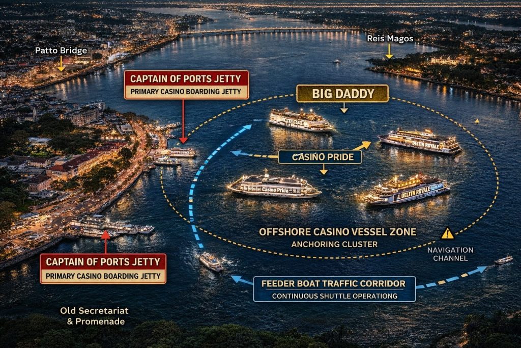 THE offshore casinos are not even spaced out, all are jammed up close to each other on a narrow stretch from the old Mandovi Hotel (now closed) river front to the Miramar beach. The casinos have been allowed to build illegal jetties for their customers all along the Mandovi river here in Panjim and its an ugly scene. It would be not an exaggeration to claim that the river Mandovi river has been taken over the offshore casino industry. Casinos everywhere in the world also become a hub for prostitution, drugs and every other kind of vice and so Goa is no different now. We have personally witnessed the gambling high rollers accompanied by call girls in the casinos. There are also hawala agents lurking in the restaurant areas of the casinos.