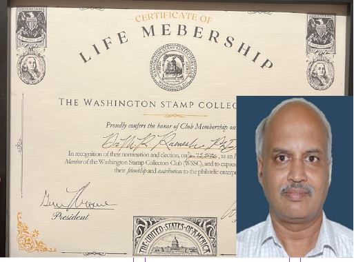 IT IS heartwarming news for retired NIO chief scientist Dr Ramesh Kumar, philatelist extraordinary. He tells us he is humbled and honored to receive the Life Membership (Honorary and Non-Resident) of the Washington Stamp Collectors Club (WSCC), Washington DC, USA. This is in recognition of his efforts towards popularizing philately among the public.