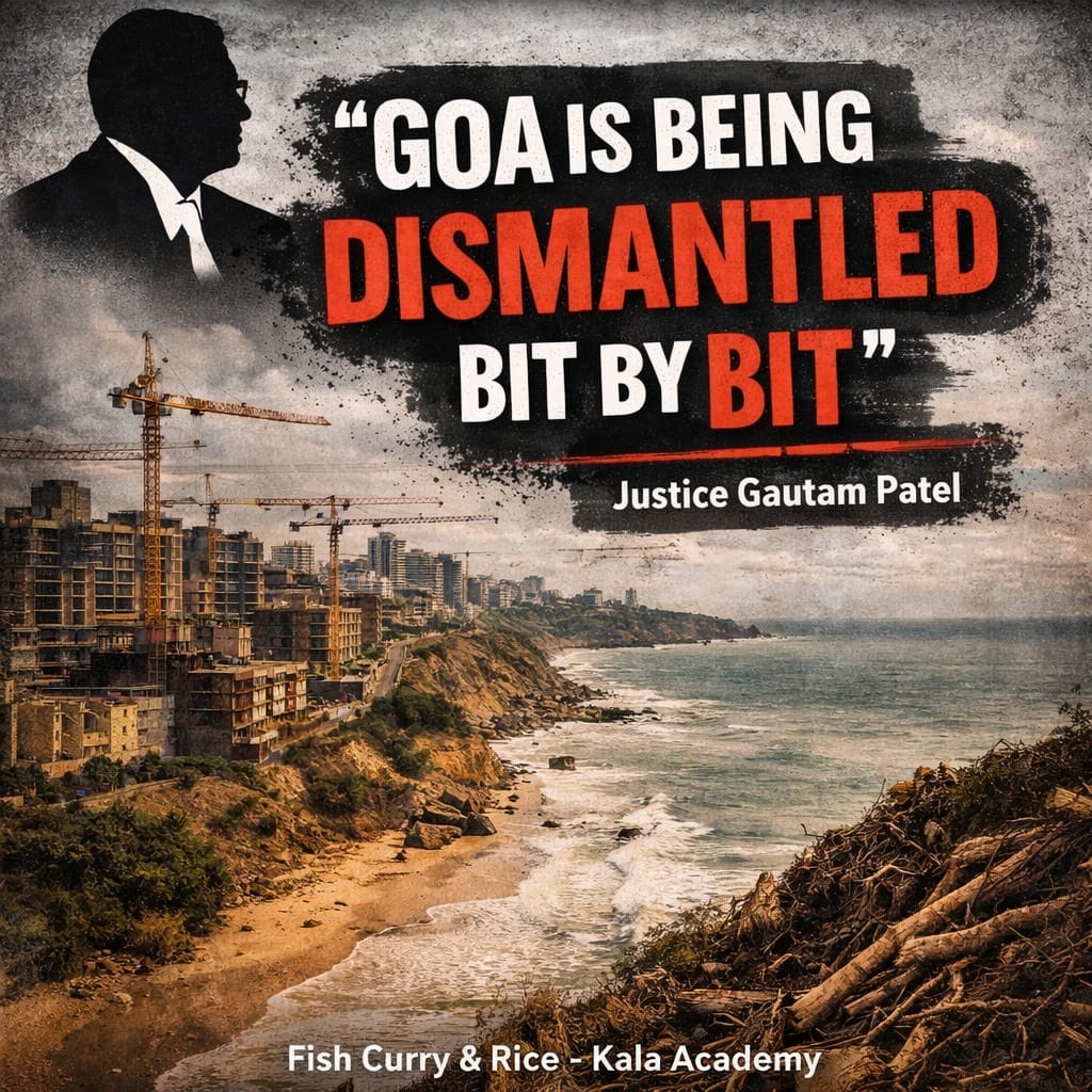 Cover Story, Mar 21- Mar 27, 2026 March 19, 2026Justice Gautam Patel whose heart beats for Goa reminded Goans that they have a duty to protect the environment. Justice Patel declared that Goa is not a peace of meat in a slaughter house. He lamented that Goa is being dismantled bit-by-bit. At the launch of the book ‘Fish Curry and Rice’ at the Kala Academy, recently, Justice Patel told Goans, ‘Don’t just post online, come out and protest’. Goan Observer takes pleasure in presenting his entire speech here…