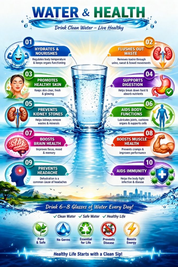 Thus, clean water is not just about preventing disease — it actively promotes optimal bodily function, supports immunity, and enhances overall well-being.