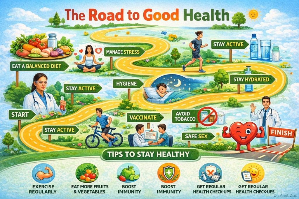 The road to good health is not a single destination but a continuous, well-guided journey shaped by daily choices and supportive environments. It begins with healthy habits — balanced nutrition, regular physical activity, adequate sleep, and good hygiene — and is strengthened by preventive care, including vaccination, screening, and regular health check-ups. Along the way, it requires mental well-being, stress management, and meaningful social connections. Avoiding harmful behaviour such as tobacco use, excessive alcohol, and unsafe practices is equally crucial.
