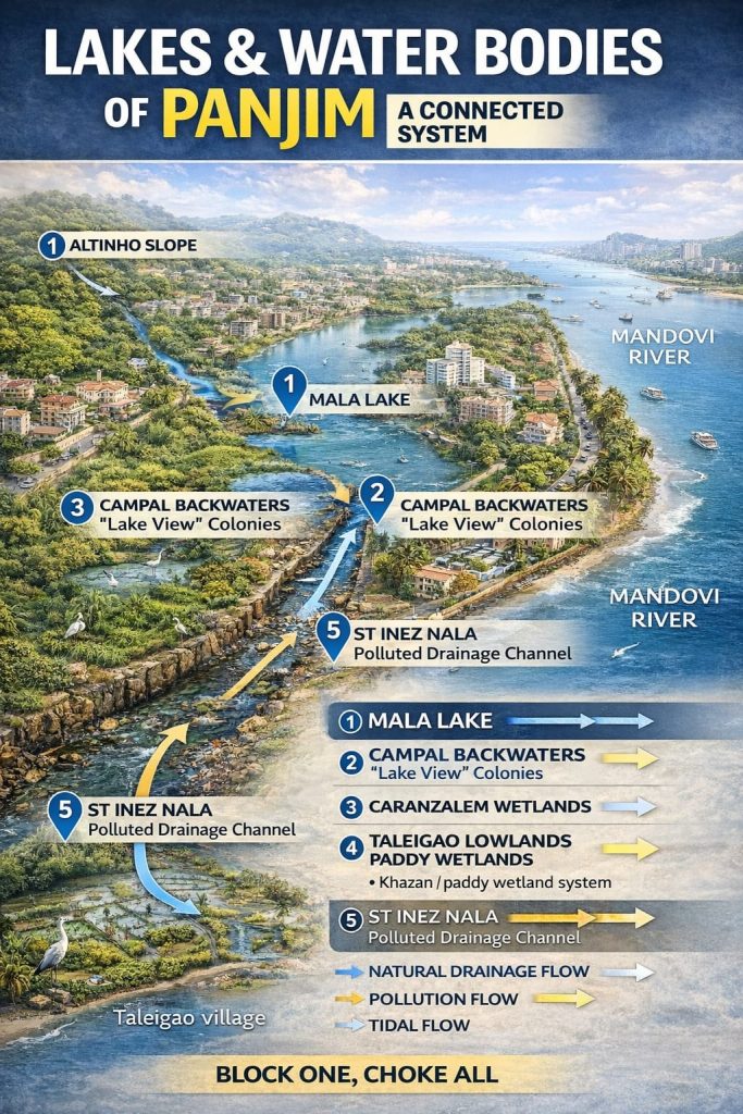 April 18- April 24, 2026, ENVIRONMENT April 17, 2026Panaji city consists of a small set of elements on the banks of lakes like Mala and Campal as well as drainage systems like the St Inez creek. Unfortunately, the natural flushing system is choked by ‘gilded buildings’ and concrete walls that have come up at the promenade at Campal which block natural flow of water.